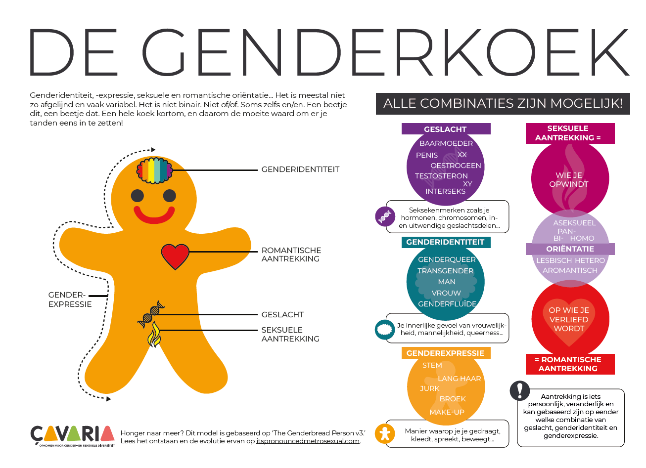 De 'genderkoek' (gebaseerd op 'The Genderbread Person' model) is een visueel en educatief hulpmiddel dat de complexiteit van gender en seksualiteit op een duidelijke manier uitlegt. Het model breekt deze concepten op in verschillende, onafhankelijke aspecten om te laten zien dat ze niet binair zijn (niet 'of/of'), maar eerder een spectrum omvatten met oneindig veel mogelijke combinaties.